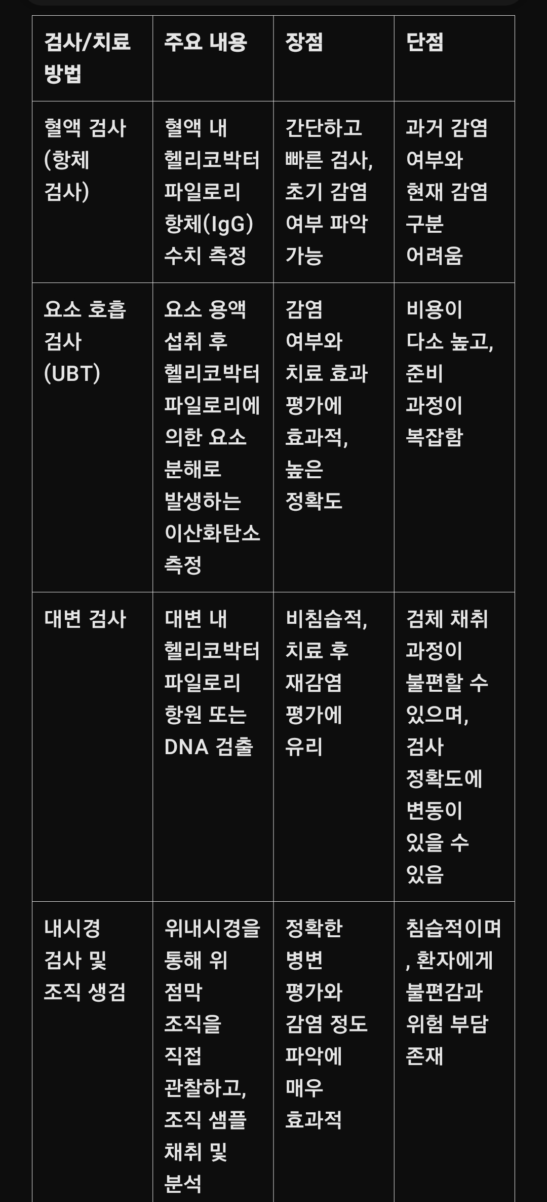 아래 표는 헬리코박터 파일로리 감염 진단과 치료에 사용되는 주요 검사 및 치료 방법의 특징과 장단점을 요약한 것입니다.