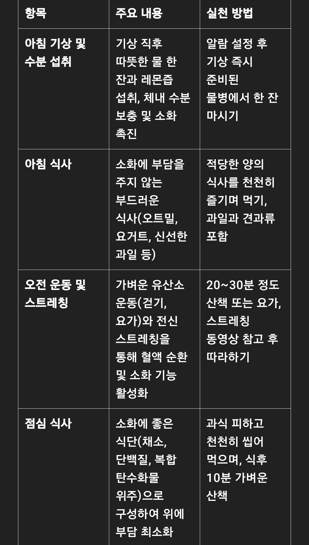 실천 팁: 기상 후 10분 이내에 준비해 둔 따뜻한 물 한 잔을 마시고, 간단한 스트레칭이나 심호흡으로 몸을 깨우세요.
