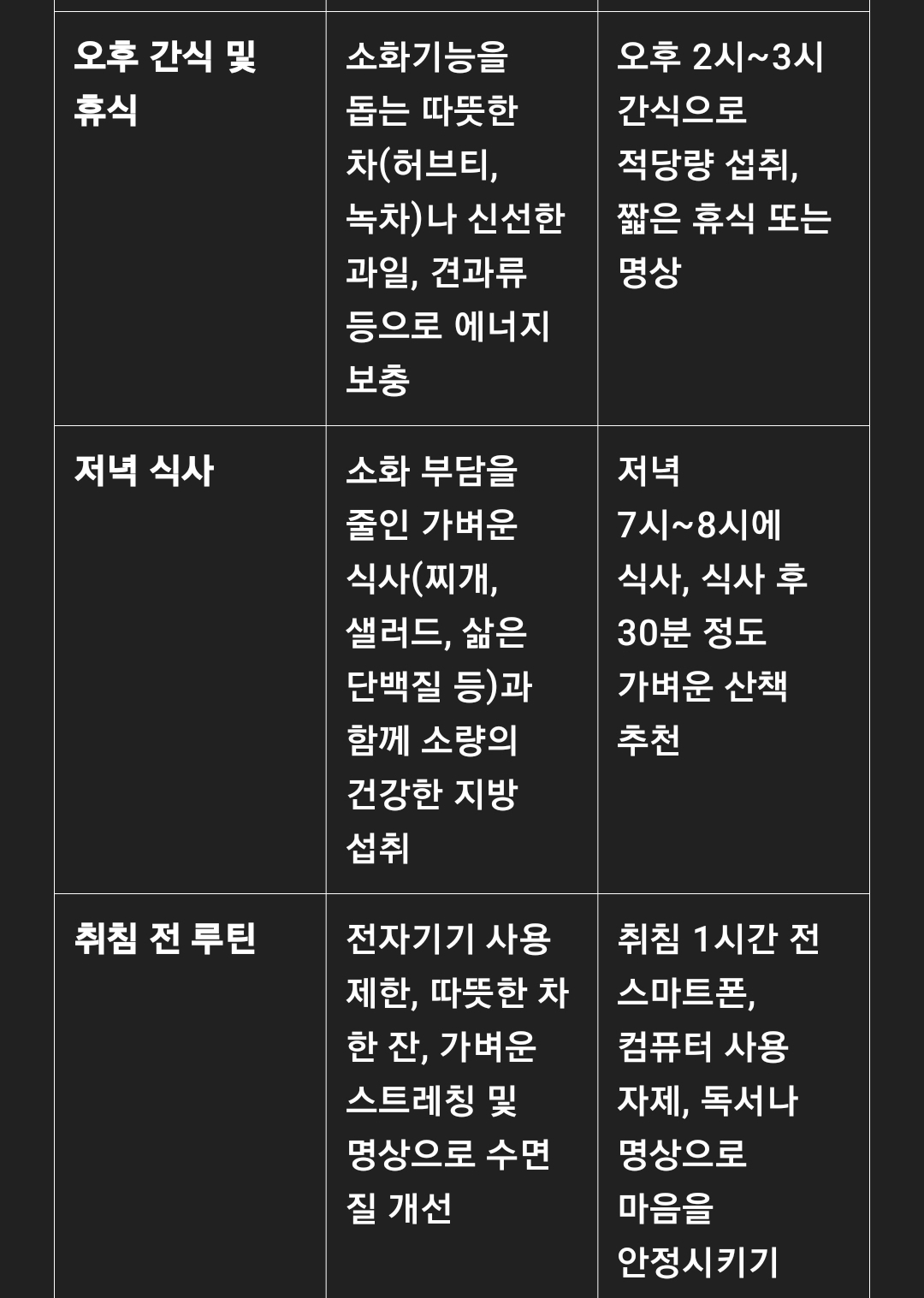 실천 팁: 저녁 식사는 7시에서 8시 사이에 섭취하며, 식사 후 30분 정도 가벼운 산책을 통해 소화를 돕습니다.