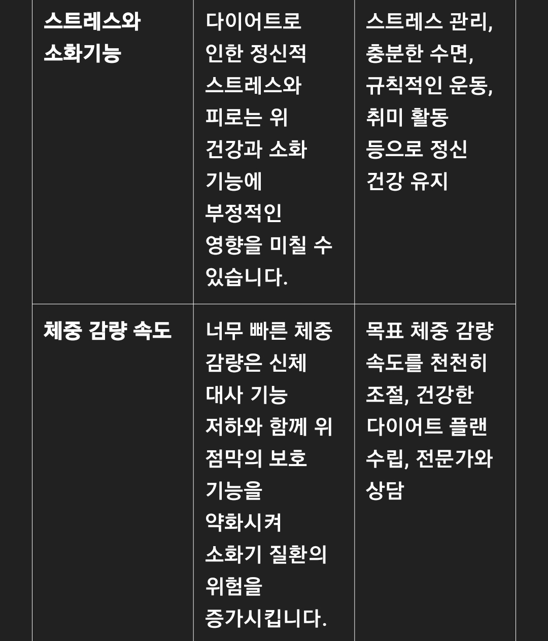 스트레스 증가: 급격한 체중 감량과 함께 정신적 스트레스가 증가하면, 이는 위 점막을 자극하여 소화기 질환의 위험을 높일 수 있습니다.