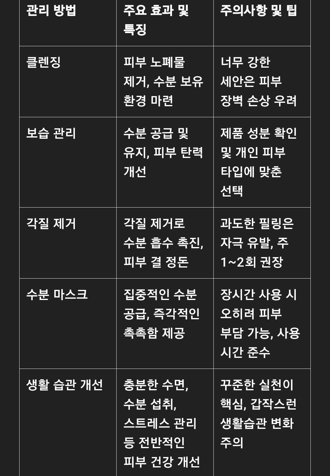 클렌징, 보습, 각질 제거, 수분 마스크 등 다양한 홈케어 방법과 함께 건강한 식습관, 충분한 수분 섭취, 규칙적인 수면, 스트레스 관리를 병행하면, 피부의 촉촉함과 탄력을 회복할 수 있습니다.