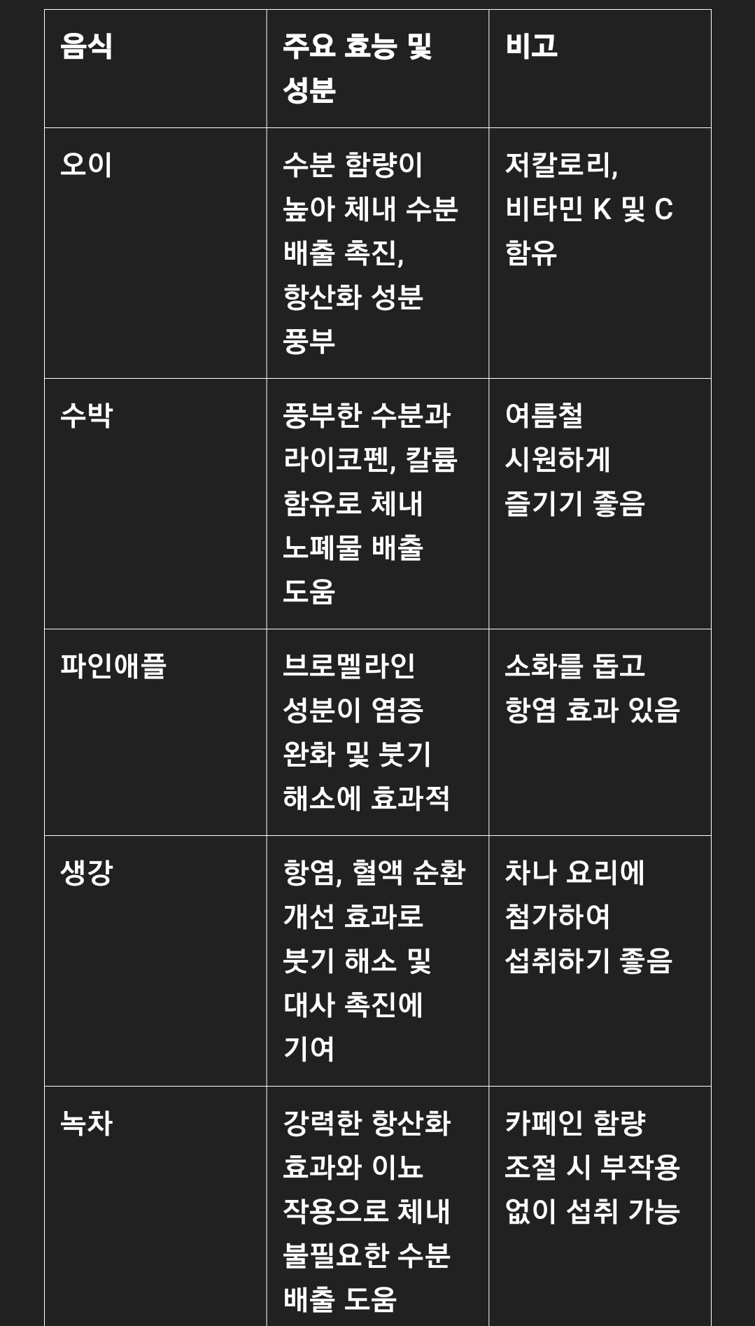 오이, 수박, 파인애플, 생강, 녹차와 같은 음식들은