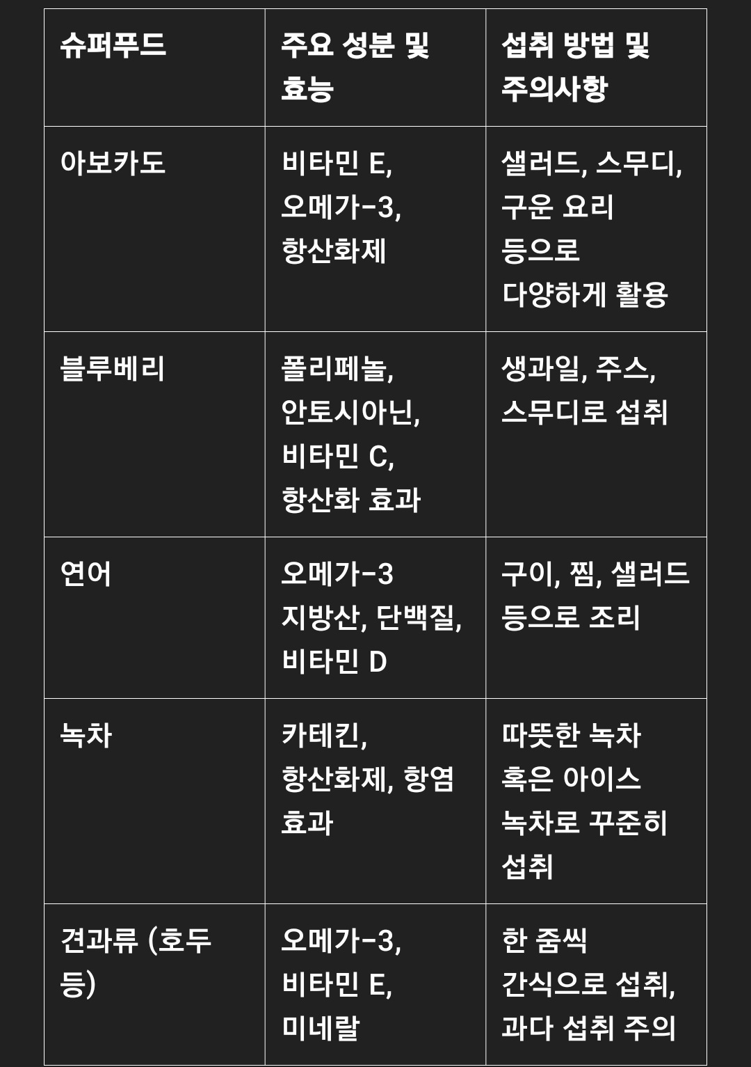 자세히 설명드리며, 각 슈퍼푸드의 주요 성분과 효과,