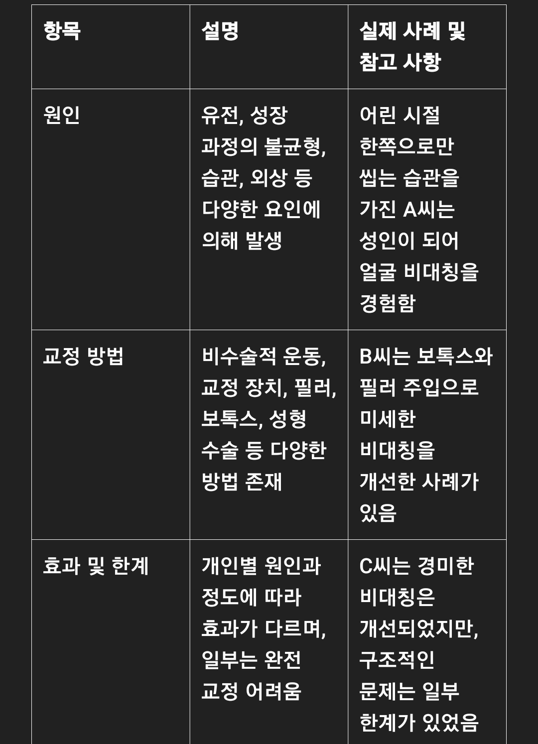 전문가들은 개인의 얼굴 구조와 비대칭 원인에 따라 교정 효과가 달라질 수 있음을 강조하며, 일부 경우에는 교정 치료 후에도 약간의 비대칭은 남을 수 있음을 미리 안내합니다.