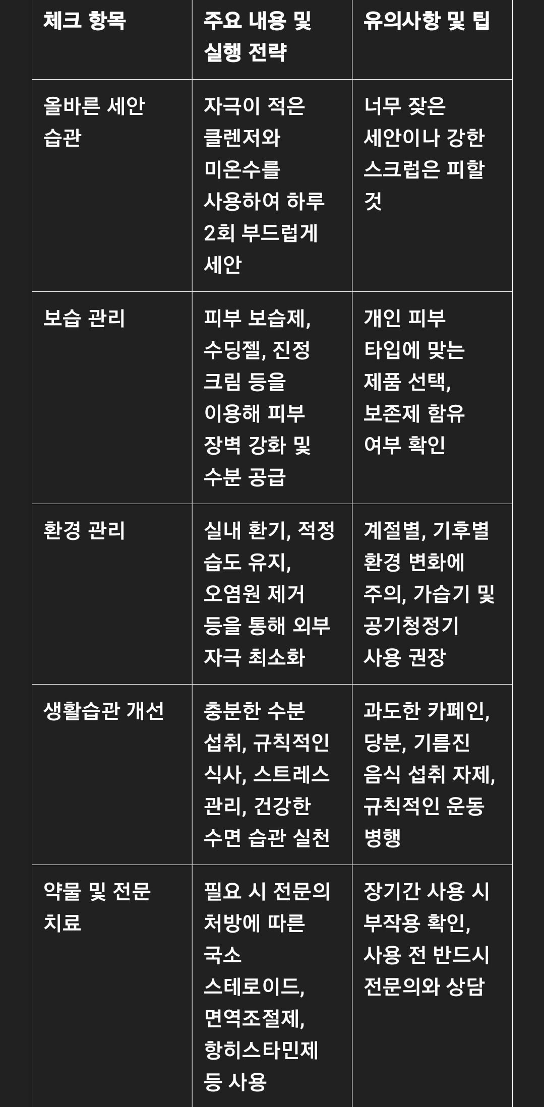 본 글에서는 올바른 세안 및 보습 관리, 충분한 수분 섭취와 규칙적인 생활, 스트레스 관리, 그리고 전문가 상담 등 체계적인 관리 방법을 종합적으로 소개드렸습니다.