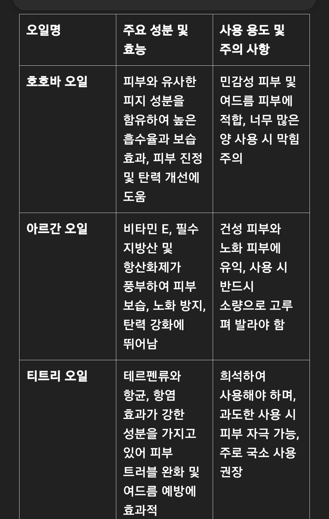 "호호바 오일과 아르간 오일은 피부에 높은 보습 효과와 영양 공급을 하여, 민감하거나 건조한 피부 개선에 뛰어난 효과를 보입니다. 티트리 오일은 강력한 항균 및 항염 효과로 여드름 관리에 특히 유익하므로, 사용 시 반드시 희석하여 국소적으로 적용하는 것이 중요합니다."