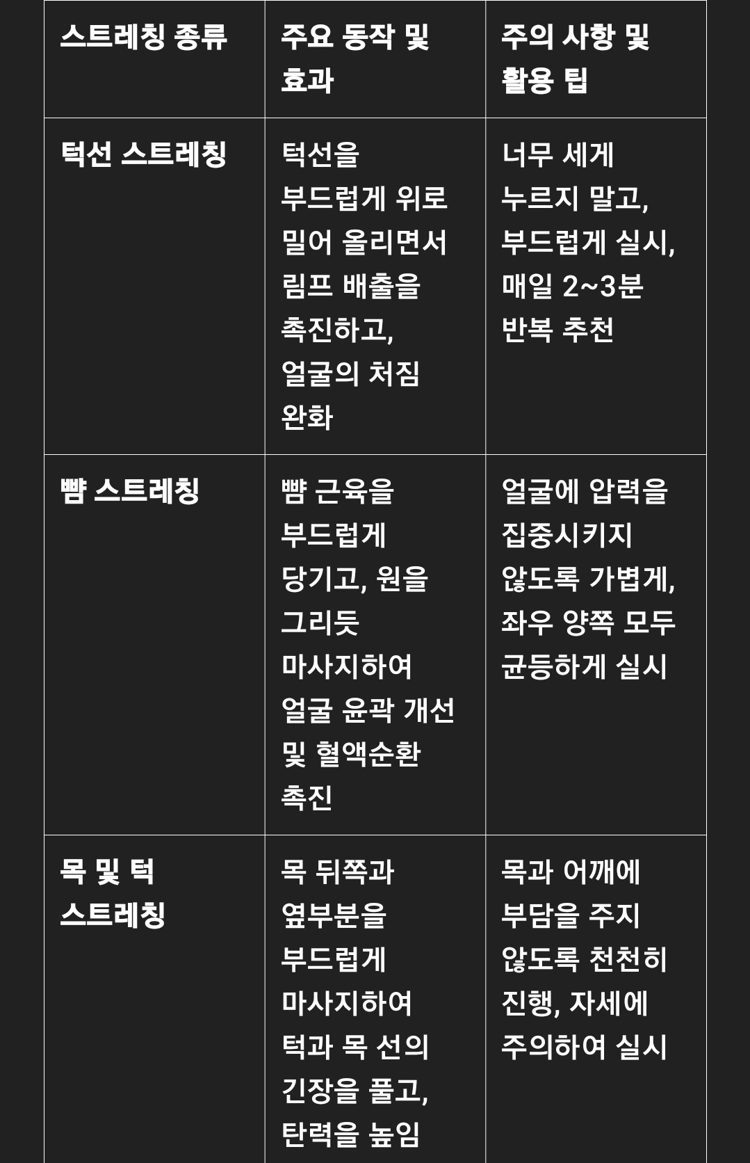 "얼굴과 목의 근육 긴장은 노화와 함께 자연스럽게 발생하지만, 꾸준한 스트레칭과 마사지로 이를 개선할 수 있습니다. 특히, 턱선 마사지와 목 스트레칭은 림프 순환을 촉진하여 피부 탄력을 향상시키는 데 큰 도움이 됩니다."