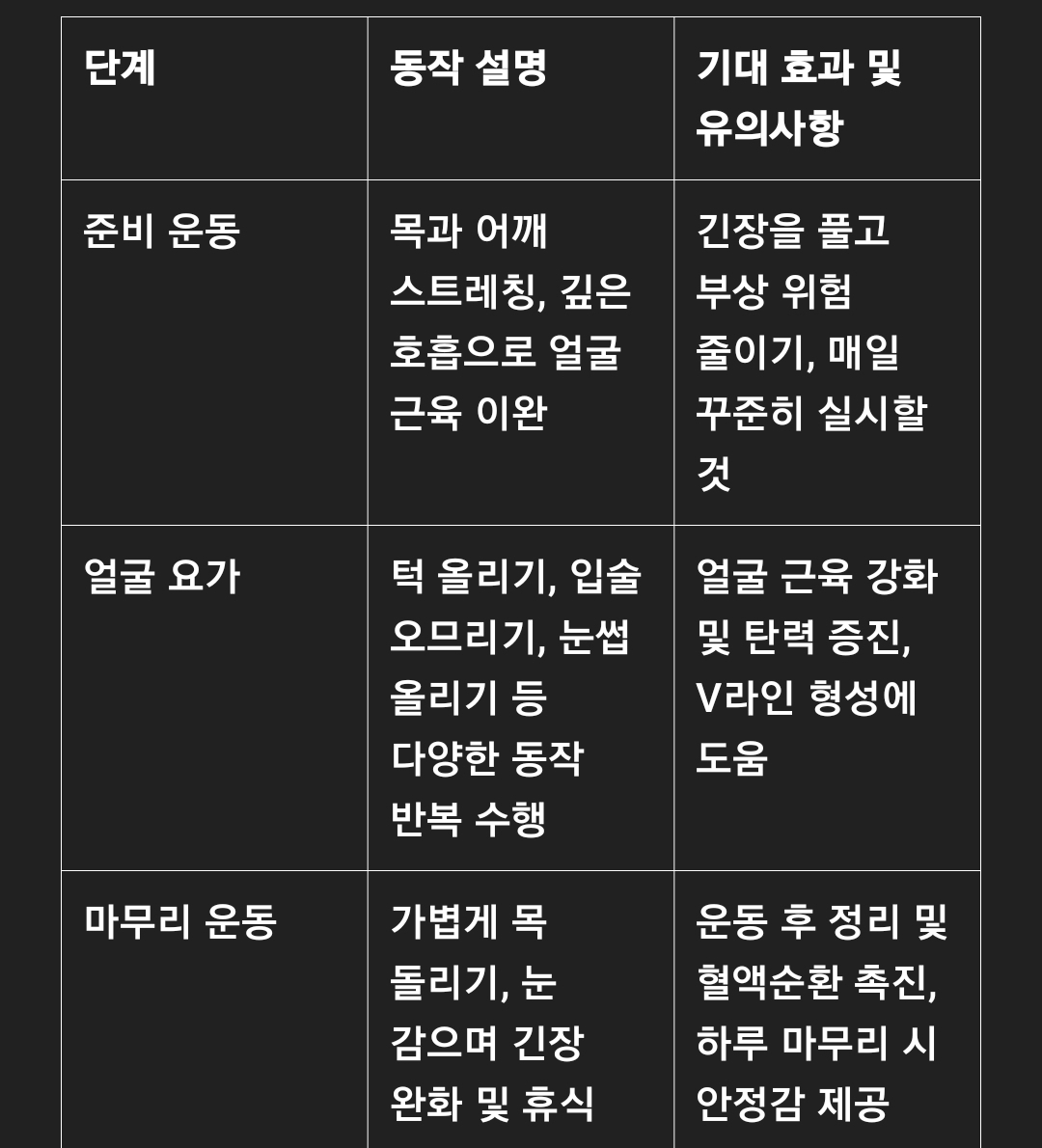 이와 같은 동작들을 조합하여 하루 10분씩 꾸준히 실천하면, 얼굴 근육의 강화를 통해 자연스러운 리프팅 효과를 느낄 수 있으며, 특히 턱선과 목 라인이 정리되어 V라인 얼굴에 가까워질 수 있습니다.