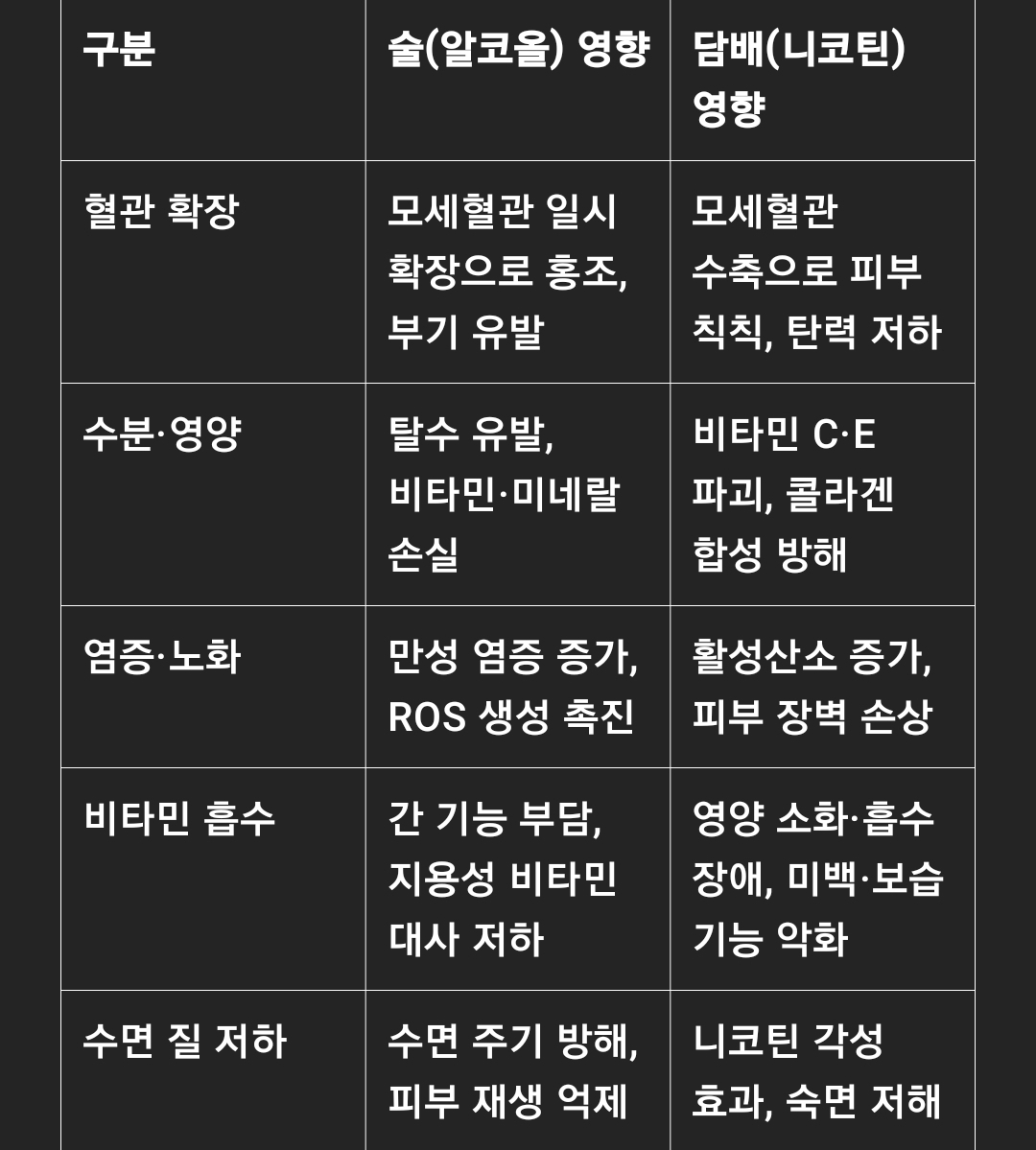 술과 담배는 단기간 즐거움을 줄 수 있지만, 얼굴 피부의 건강과 아름다움을 크게 해치는 주범입니다. 혈관·수분·영양·염증·재생 등 다방면에서 악영향을 미치므로, 절주·금연이야말로 깨끗한 피부 톤과 노화 방지의 가장 확실한 방법입니다. 오늘 소개해드린 과학적 근거와 실제 사례를 참고해, 피부 건강을 지키는 생활 습관을 실천하시길 진심으로 응원합니다.