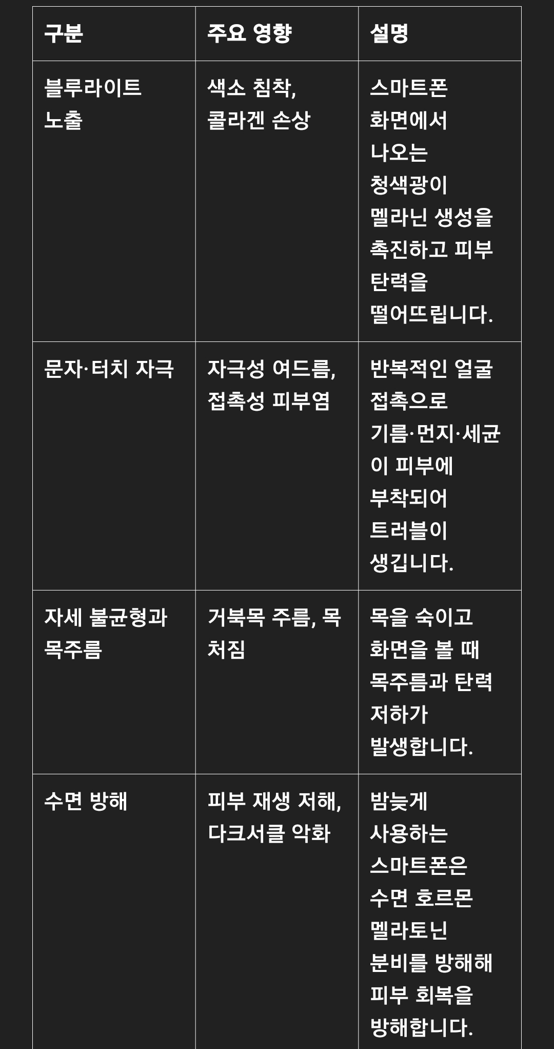 요즘 우리는 하루에도 수백 번 스마트폰 화면을 바라봅니다. 손에 쥐고 터치하고, 메시지를 확인하다 보면 어느새 얼굴과 목 주변 피부가 무심코 자극받고, 블루라이트로 인해 내부 손상까지 일어나기도 합니다. 특히 젊은 세대뿐 아니라 중장년층에서도 스마트폰 과사용으로 인한 피부 트러블 사례가 늘고 있는데요. 스마트폰 사용이 피부에 어떤 악영향을 주는지, 그 메커니즘과 예방·개선 방법을 구체적인 사례와 함께 살펴보겠습니다.