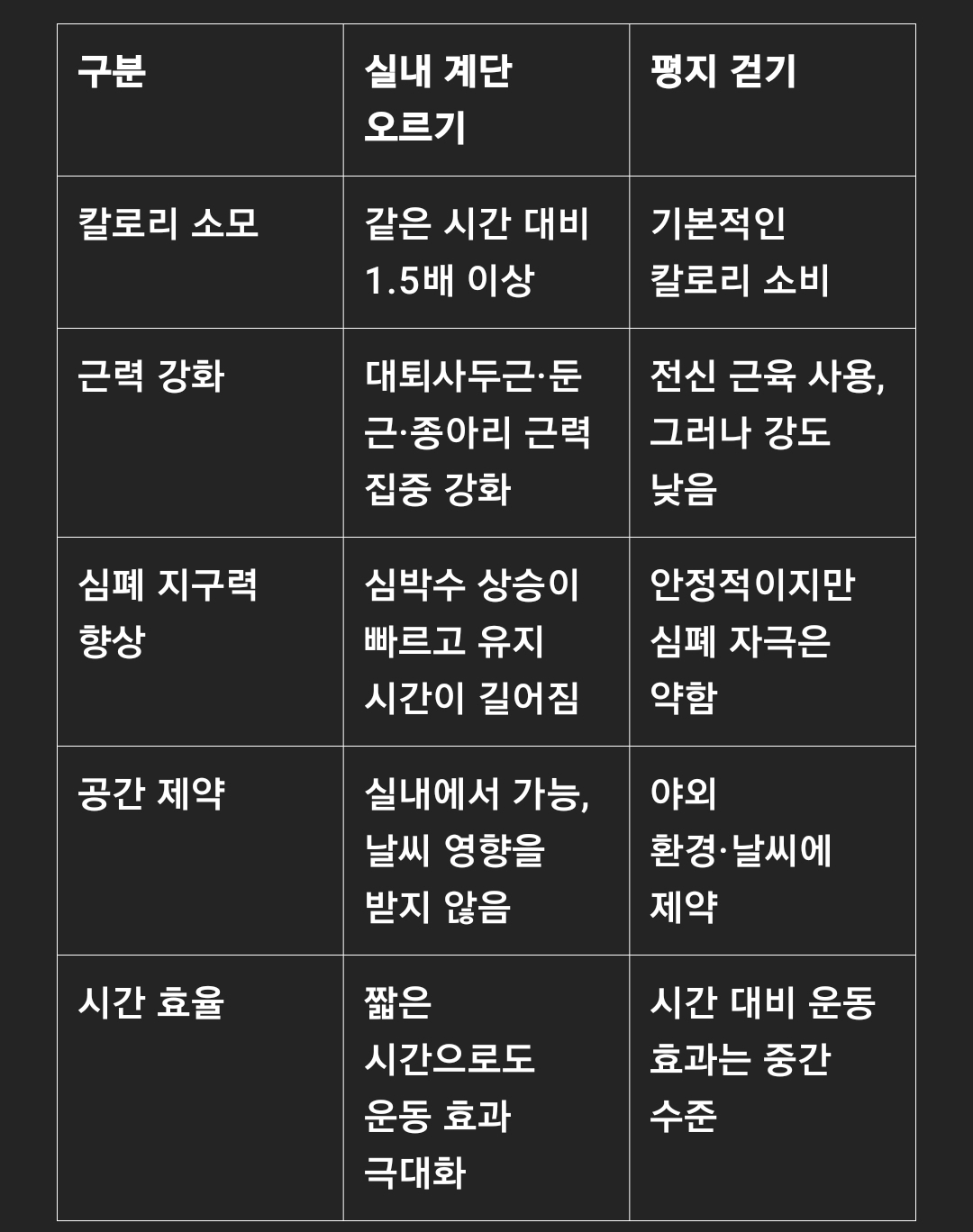 운동 강도: 계단 오르기는 중강도에서 고강도까지 조절 가능하며, 짧은 시간에 심박수를 끌어올릴 수 있습니다.