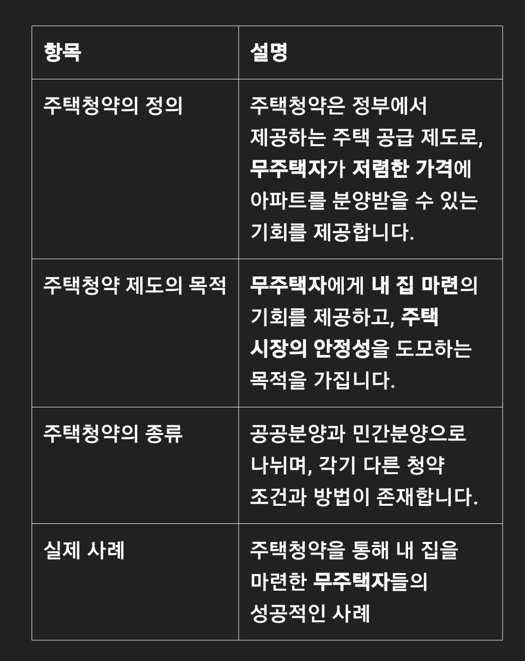 주택청약 제도는 무주택자를 대상으로 하여, 소득이나 가점 등을 기준으로 분양 받을 수 있는 우선권을 부여합니다. 이 제도는 장기적인 주거 안정을 목표로, 무주택자에게 내 집 마련의 기회를 주기 위한 중요한 수단으로 자리잡고 있습니다.