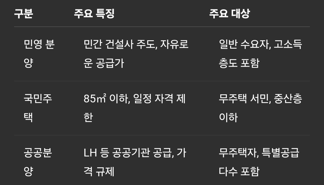 분양은 크게 세 가지로 나뉩니다. 민영 분양, 국민주택, 공공분양입니다. 이들은 각각 공급 주체와 입주 대상, 혜택의 기준이 다르기 때문에 청약 전략을 세우기 위해서는 구분을 명확히 이해해야 합니다.