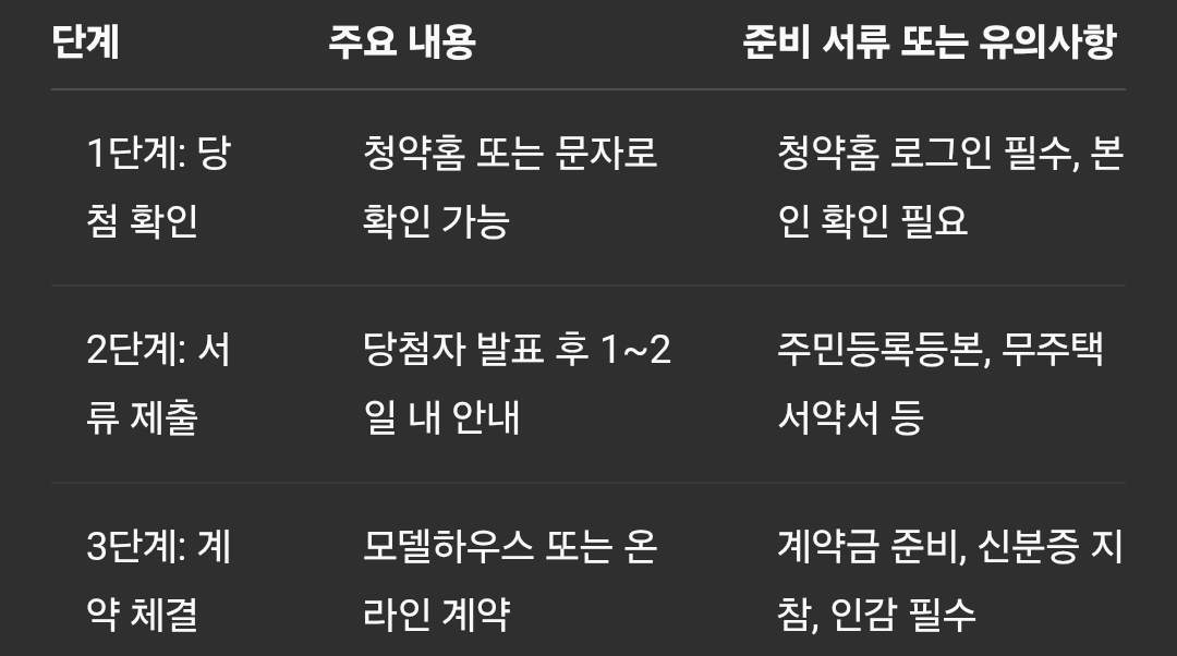 단순히 '당첨'이라는 알림만 받고 준비 없이 다음 단계를 넘기면, 자칫 중요한 제출 기한을 놓칠 수 있으므로 당첨 직후에는 반드시 공고문에 명시된 향후 일정(서류 제출 기간, 계약일 등)을 꼼꼼히 확인하는 것이 우선입니다.