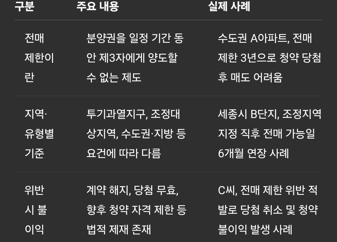 위반 시 불이익 계약 해지, 당첨 무효, 향후 청약 자격 제한 등 법적 제재 존재 C씨, 전매 제한 위반 적발로 당첨 취소 및 청약 불이익 발생 사례