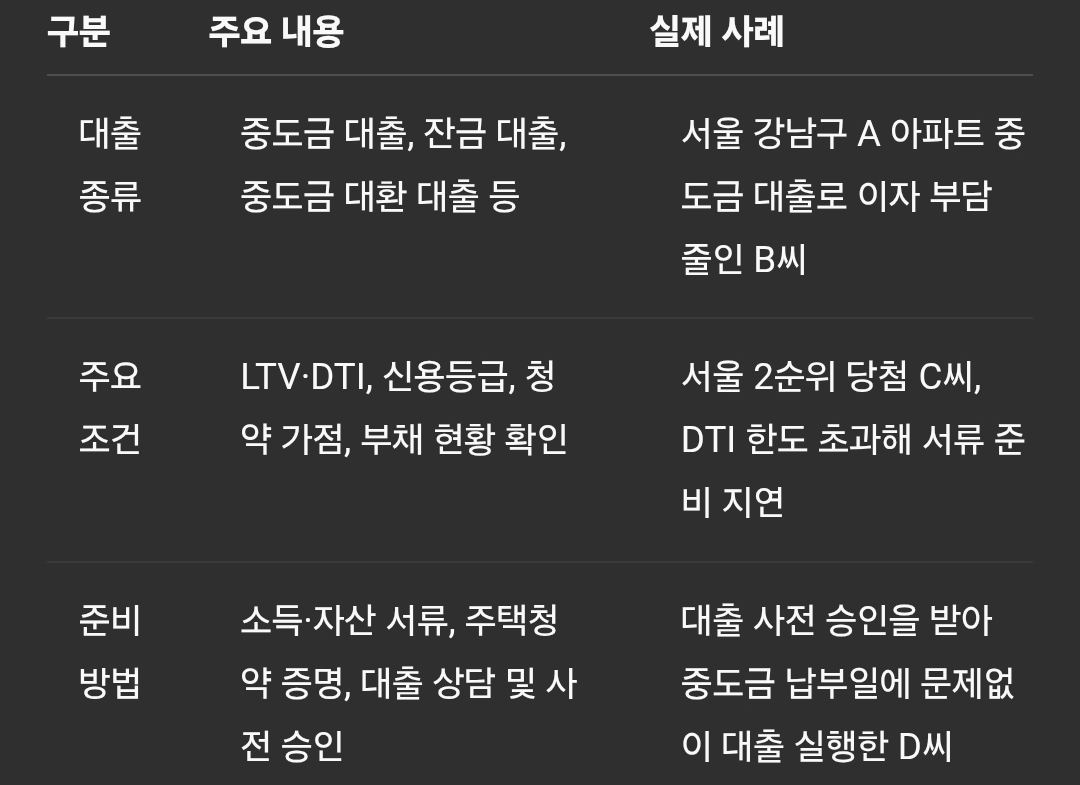준비 방법 소득·자산 서류, 주택청약 증명, 대출 상담 및 사전 승인 대출 사전 승인을 받아 중도금 납부일에 문제없이 대출 실행한 D씨