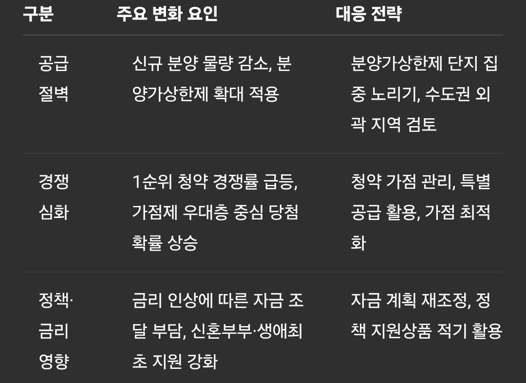 신축 공급 부족 시대가 도래하면서 분양 시장은 과열 양상을 보이고 있습니다. 예년 대비 줄어든 신규 분양 물량은 청약 경쟁률을 폭등시키고, 가점제 당첨 우대층이 더욱 유리해지는 구조적 변화를 초래합니다. 이에 따라 청약 전략도 변화가 불가피해졌습니다.