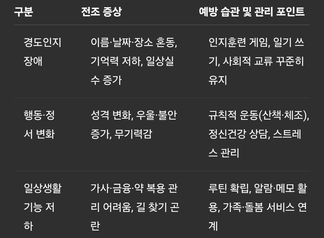 일상생활 기능 저하 가사·금융·약 복용 관리 어려움, 길 찾기 곤란 루틴 확립, 알람·메모 활용, 가족·돌봄 서비스 연계