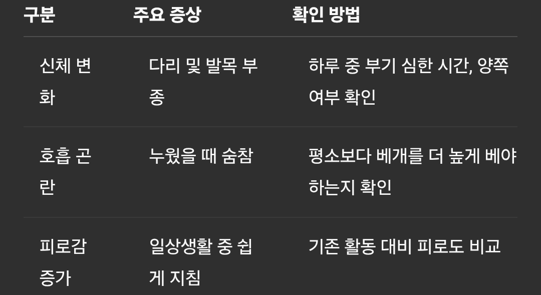 특히 60세 이후의 중장년층에서는 단순한 피로, 부종, 숨참을 나이 탓으로만 돌려버리는 경우가 많습니다. 그러다 병이 상당히 진행된 이후 병원을 찾게 되는 경우가 많아, 조기 검진과 정확한 증상 인지가 중요합니다.