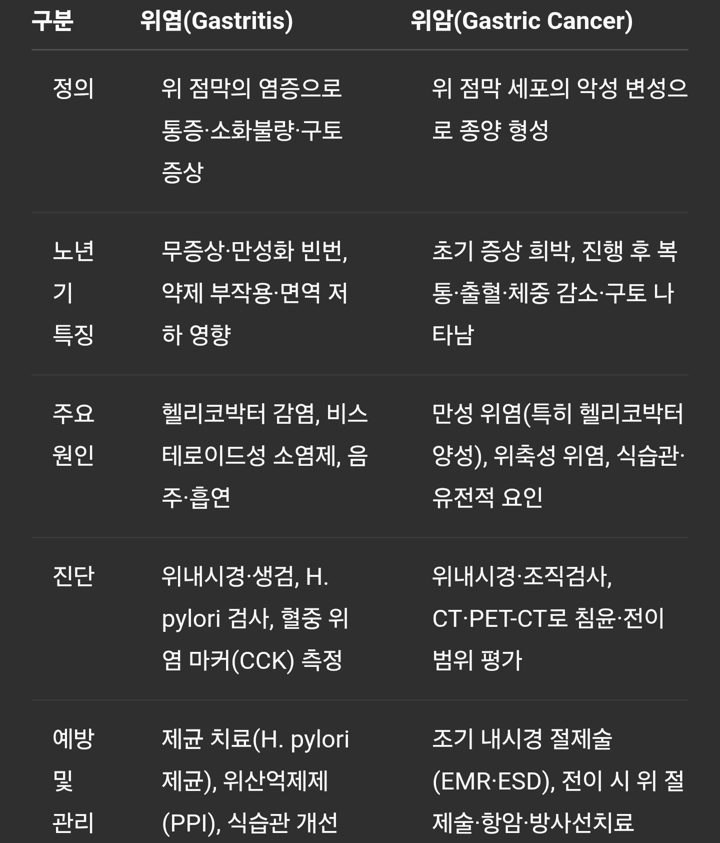 노년기 위염과 위암은 통증 없이 진행될 수 있어 더욱 위험합니다. 헬리코박터 제균, 식습관 개선, 위산억제제 사용, 정기 위내시경 등 예방·조기 진단 전략을 철저히 지켜야 합니다.