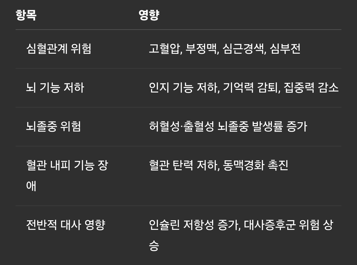 수면무호흡증은 단순히 수면 질만 떨어뜨리는 것이 아니라 심장과 뇌를 포함한 전신 장기의 건강을 위협합니다. 반복적인 저산소와 교감신경 과활성으로 고혈압, 부정맥, 뇌졸중, 인지 저하 등 심각한 합병증이 발생할 수 있기 때문에, 의심 증상이 있는 경우 즉시 검사와 치료를 시작해야 합니다.