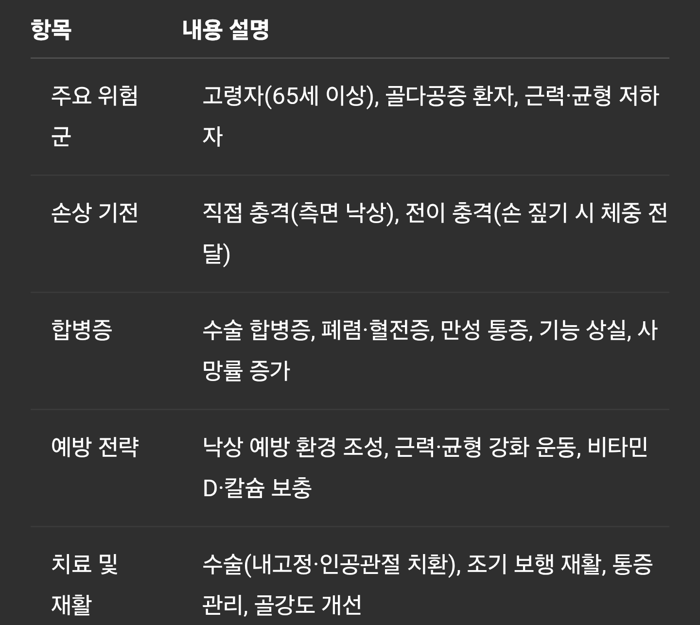 치료 및 재활 수술(내고정·인공관절 치환), 조기 보행 재활, 통증 관리, 골강도 개선