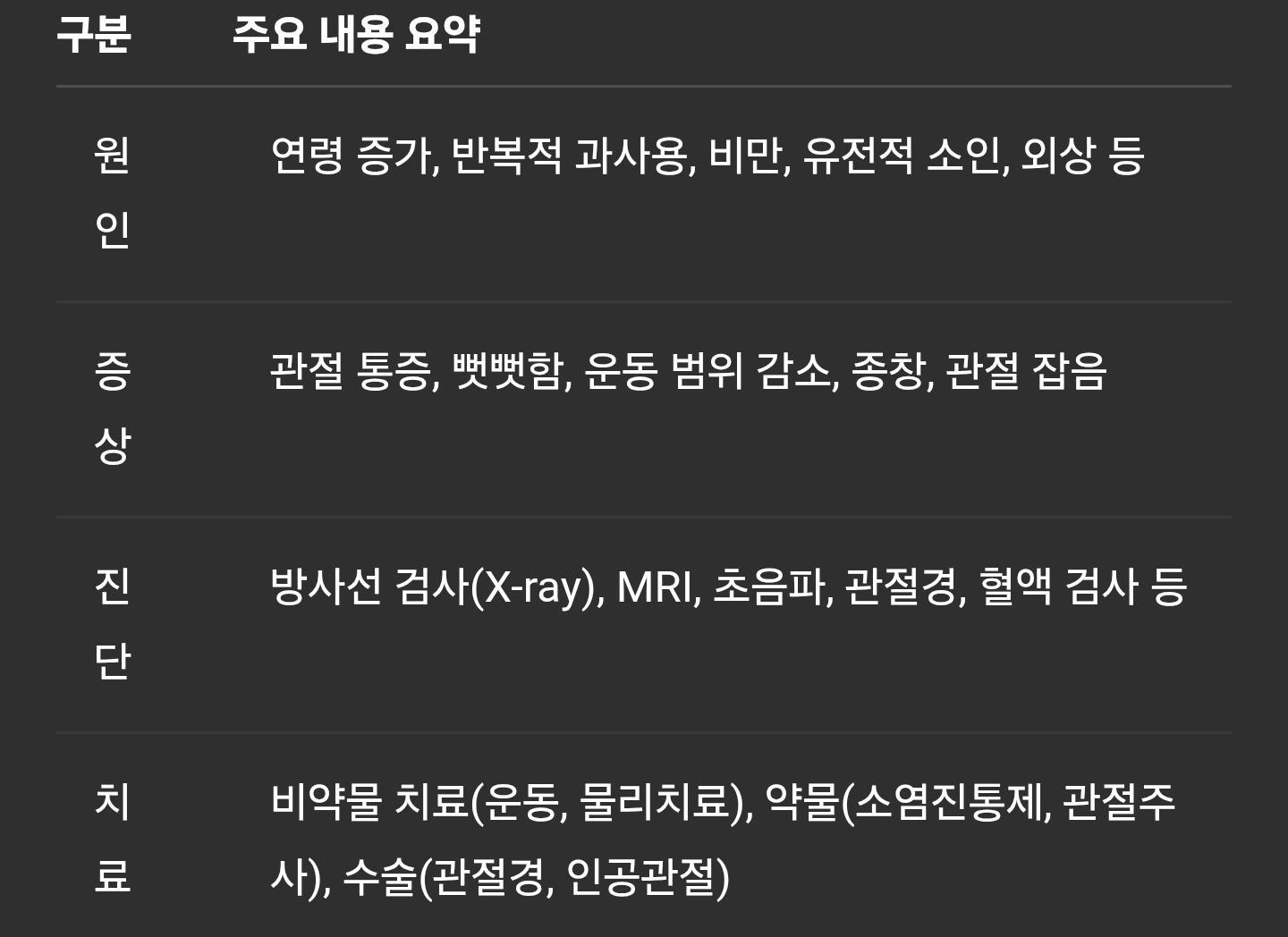 치료 비약물 치료(운동, 물리치료), 약물(소염진통제, 관절주사), 수술(관절경, 인공관절)