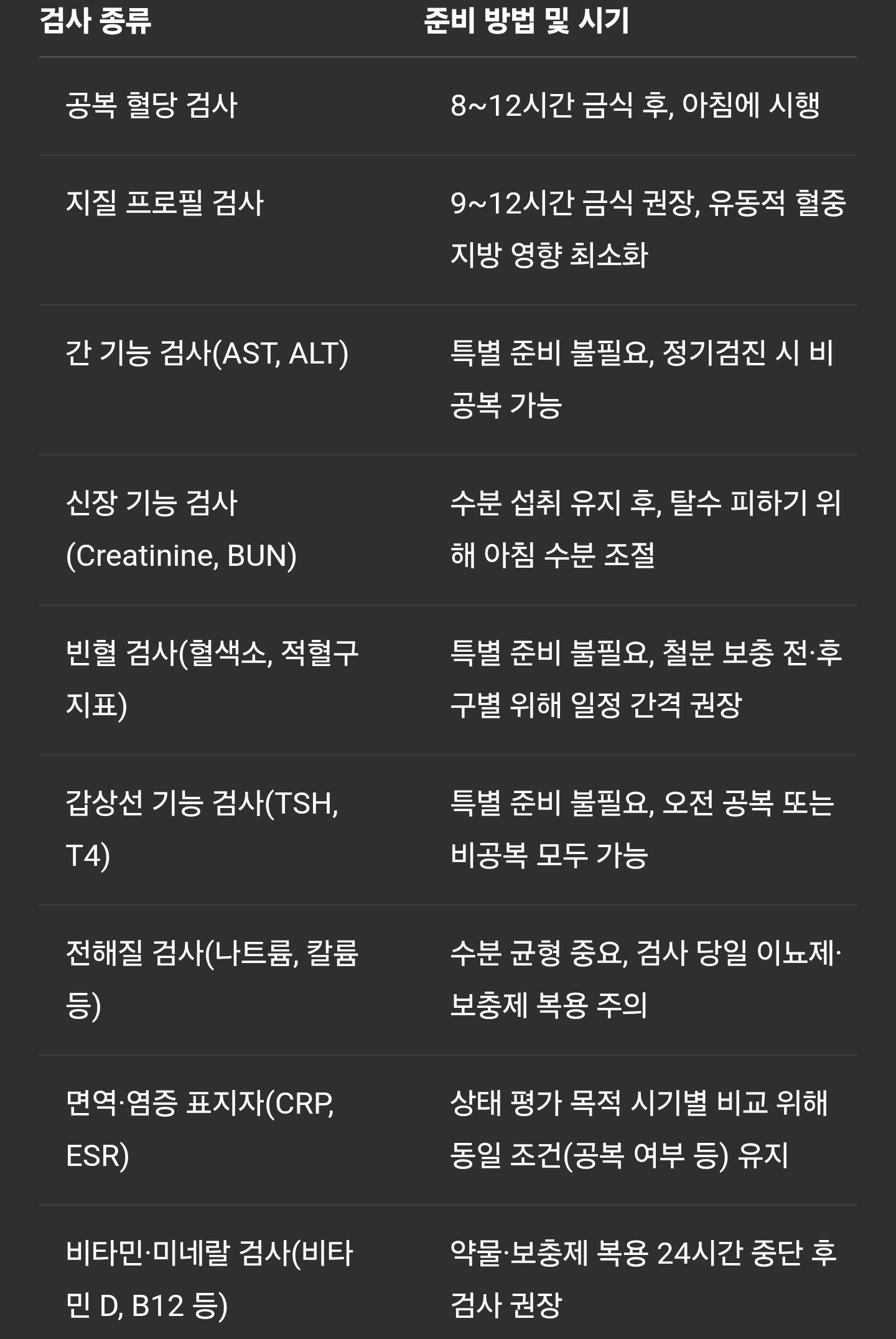 간 기능 검사(AST, ALT) 특별 준비 불필요, 정기검진 시 비공복 가능