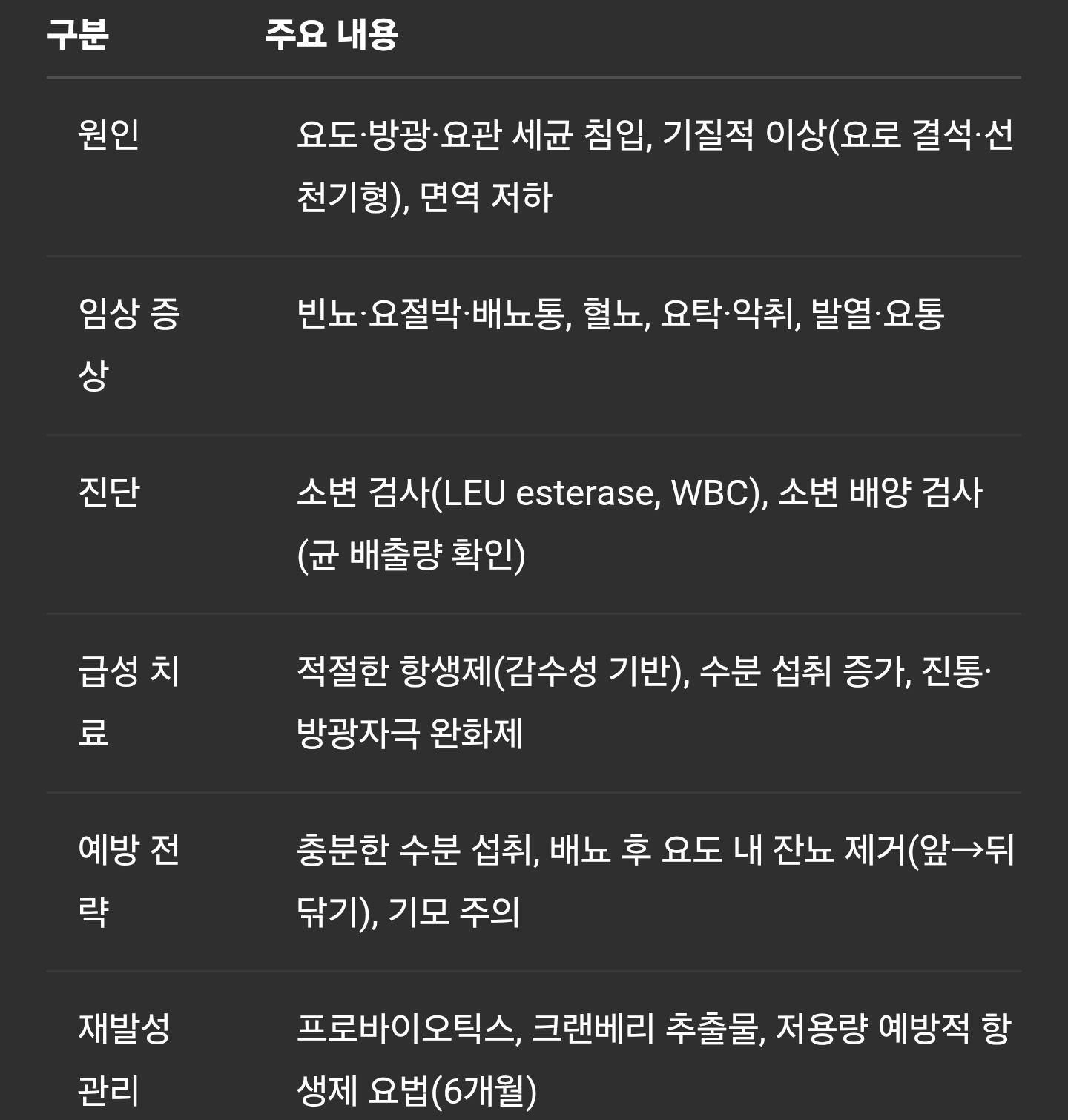 예방 전략 충분한 수분 섭취, 배뇨 후 요도 내 잔뇨 제거(앞→뒤 닦기), 기모 주의