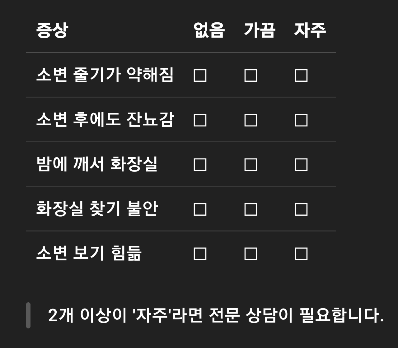소변 후에도 잔뇨감 ☐ ☐ ☐