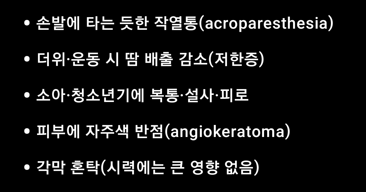원인: GLA 유전자 변이 → 알파-갈락토시다아제 A 효소 결핍